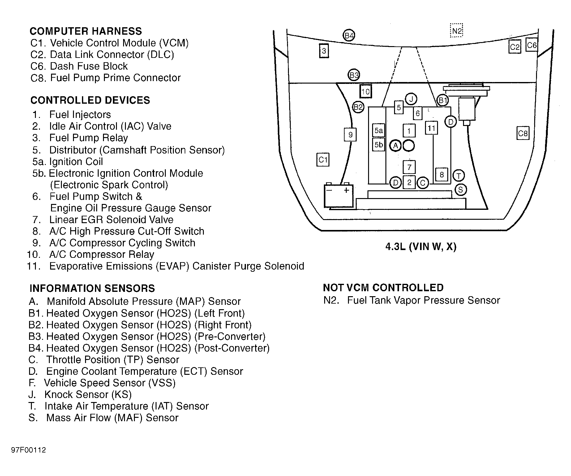 | Vehicle Control Module (VCM) (4.3L VIN W, X) | On right front of engine compartment. See Figure. |