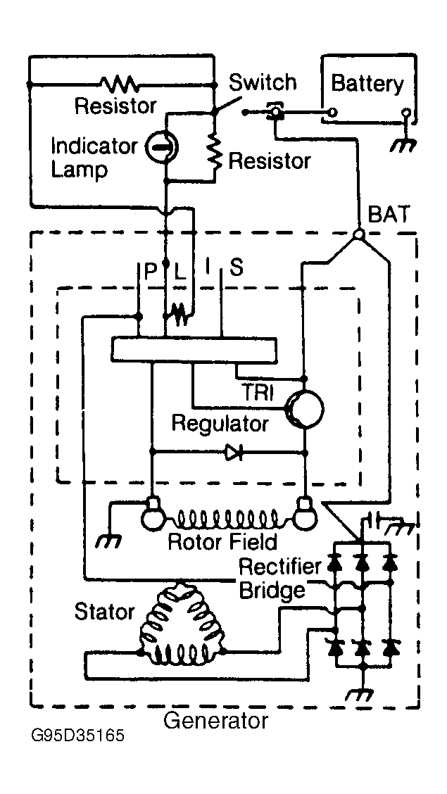Generator operates with 2 wire connections and a ground path through the mounting bracket. The first wire connection is the BAT (output) terminal. This terminal must be connected to the battery during operation. The second wire connection is connected from generator internal regulator lamp driver to PCM. This circuit monitors and controls generator operation.