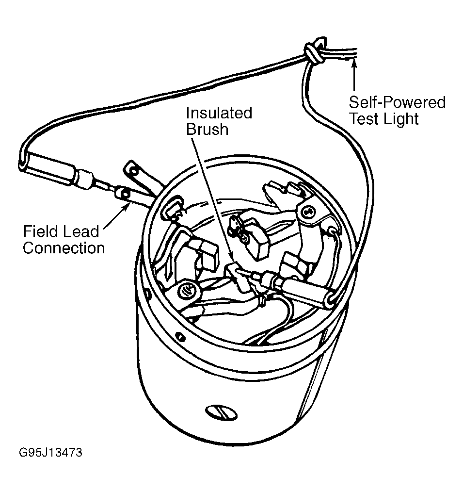 Remove armature from frame and field assembly. Using self-powered test light, place one lead on field lead connection and other lead on one insulated brush. See Fig 1. Test light should illuminate. If test light does not illuminate, field coil is open. Replace field and frame assembly. Repeat test for each insulated brush.