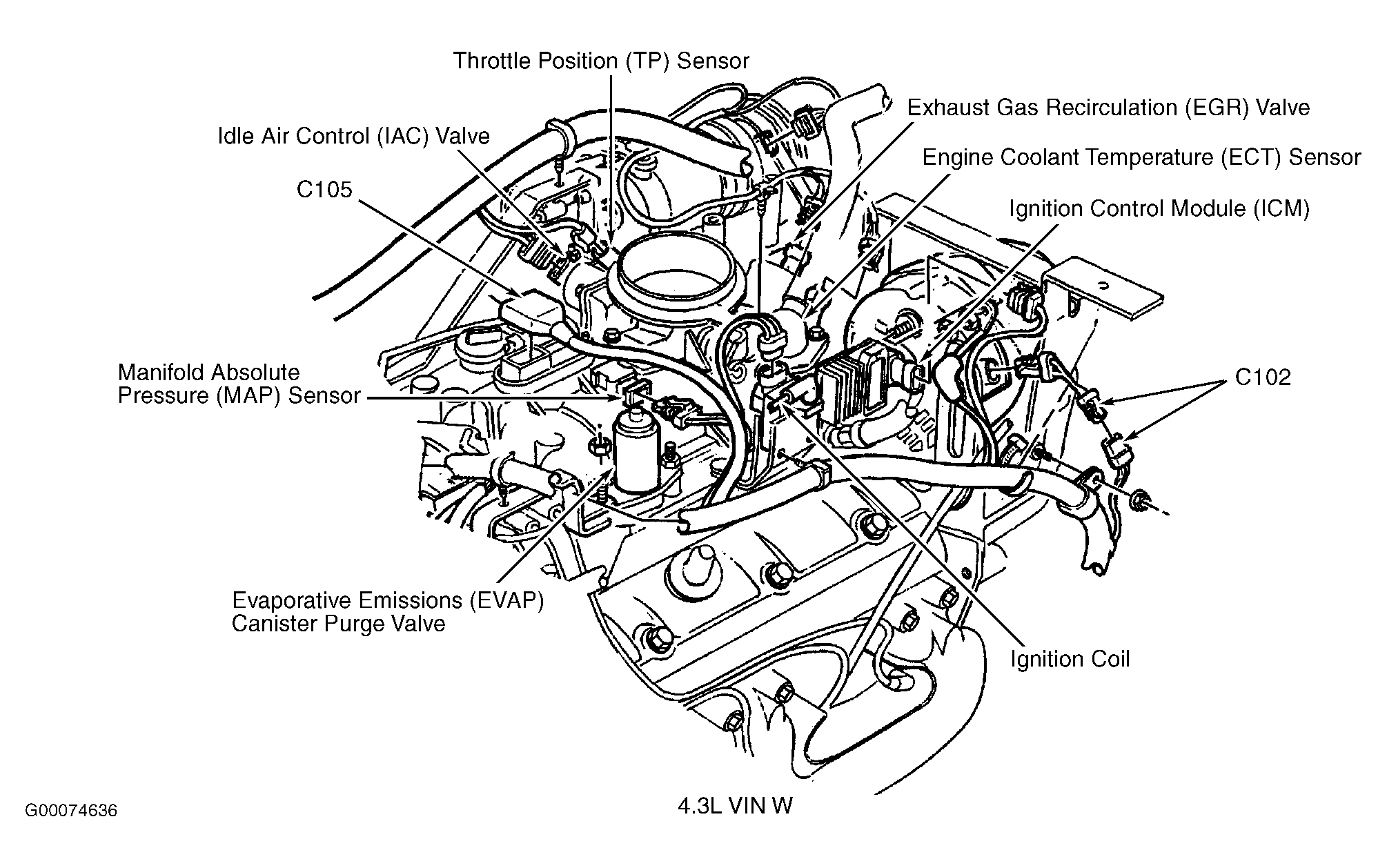 Ignition Control Module (ICM) (4.3L VIN W) On right top of engine, at ignition coil. See Figure.