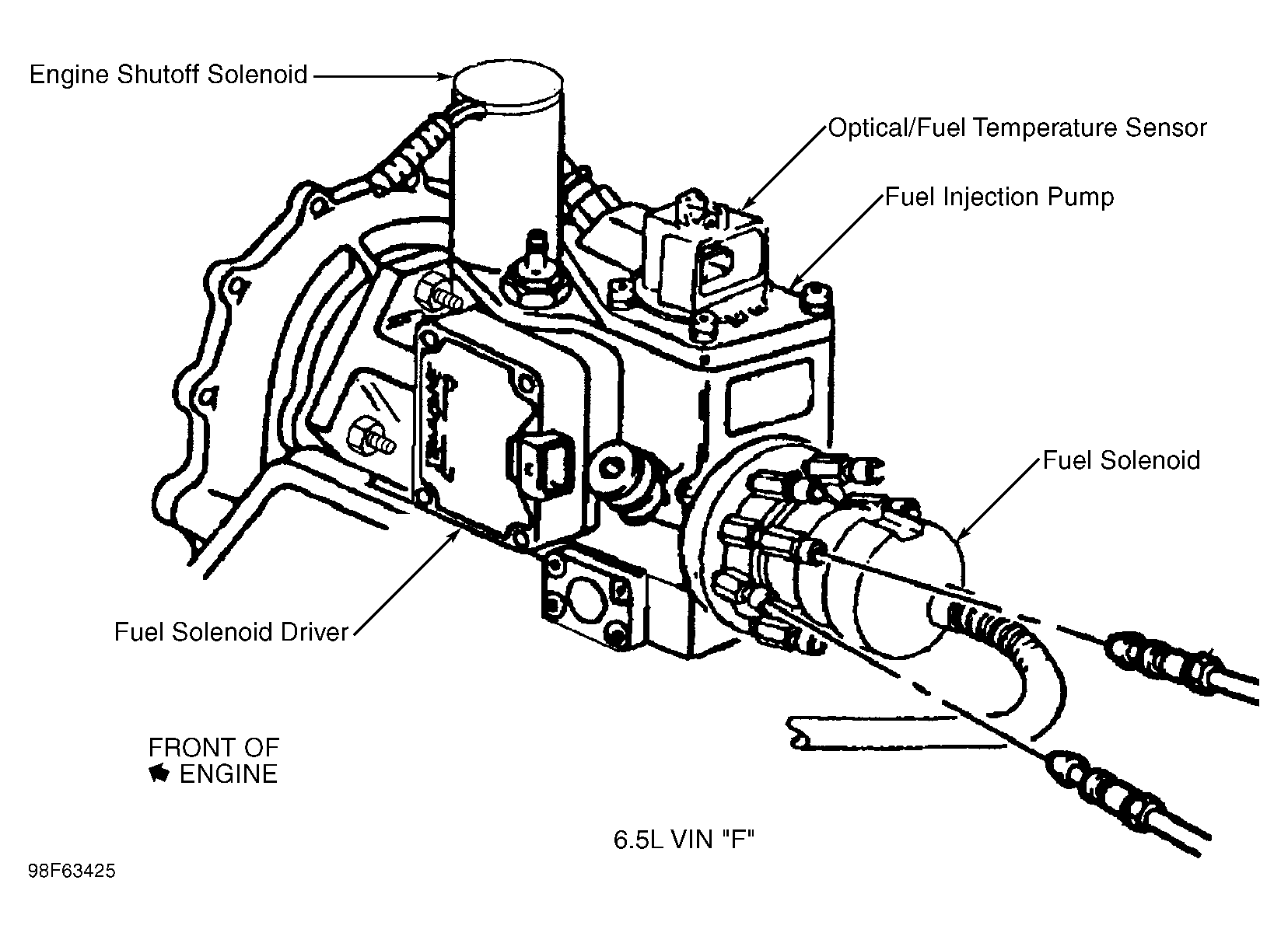Fuel Solenoid Driver (6.5L VIN F) On side of fuel injection pump. See Figure.
