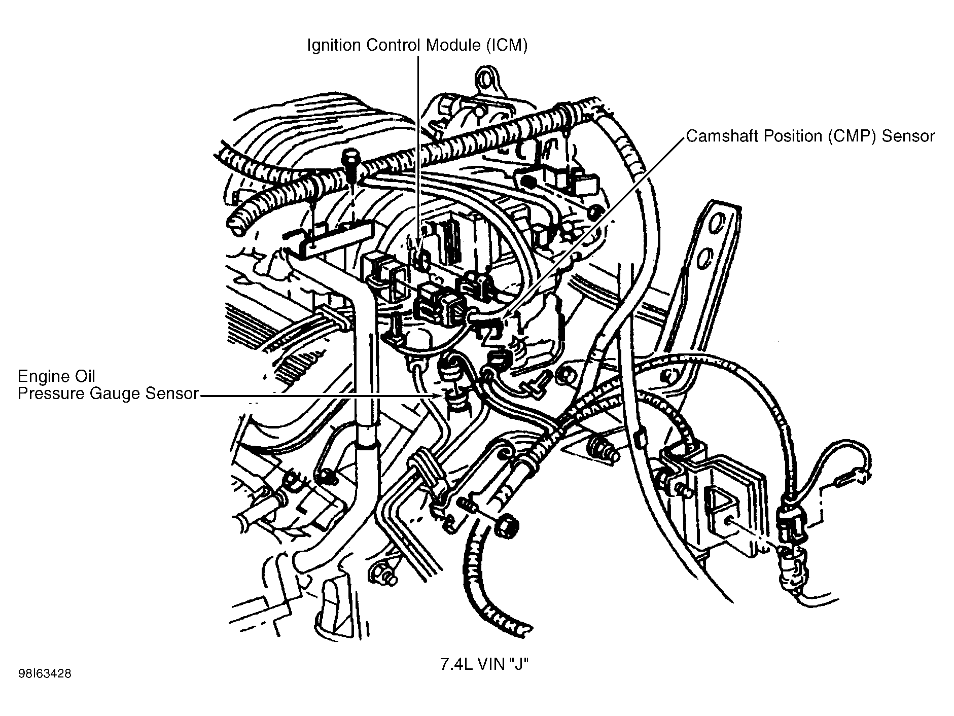 Ignition Control Module (ICM) (7.4L VIN J) On bracket at rear of intake plenum. See Figure.