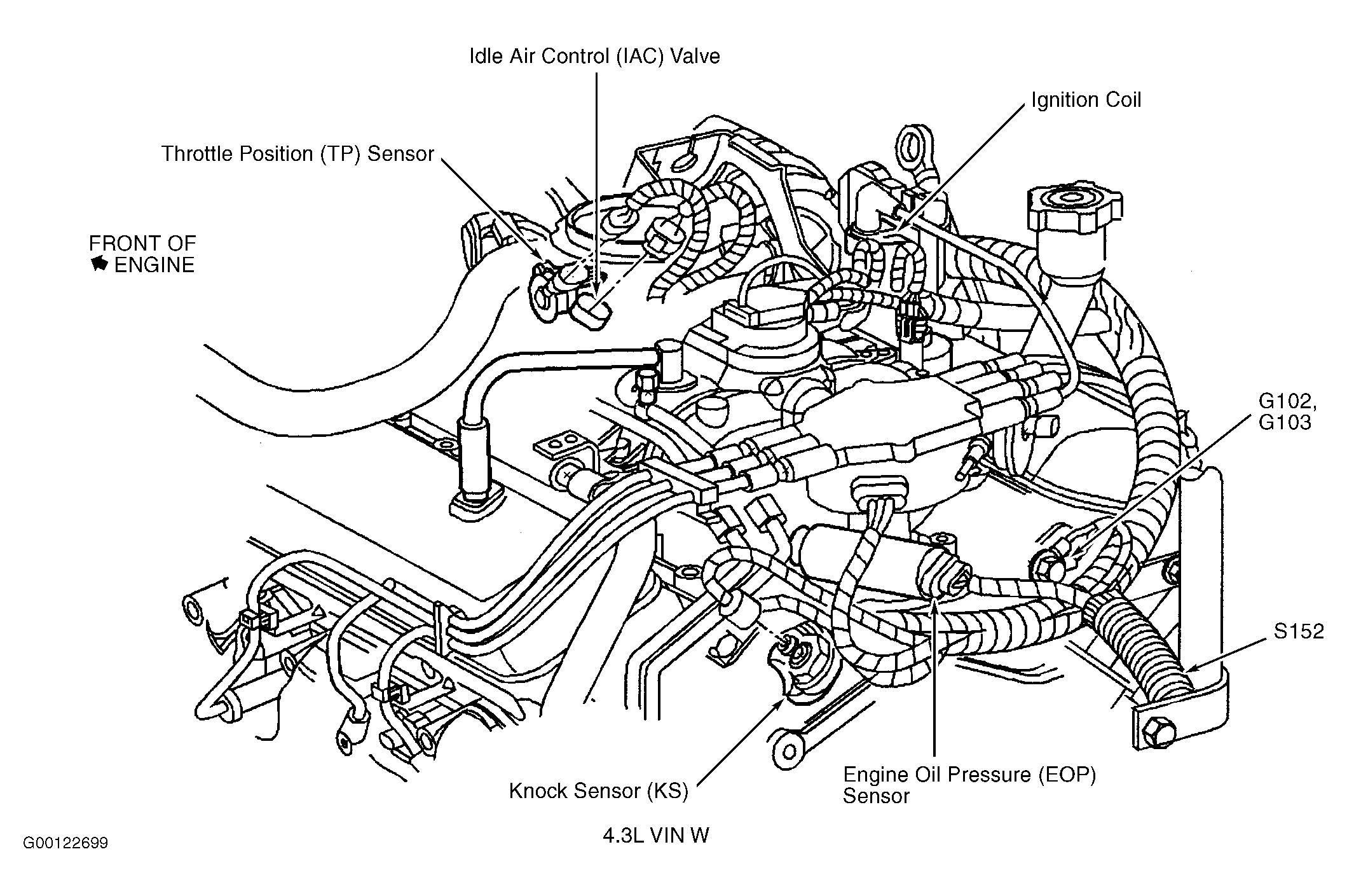 | S152 (4.3L VIN W) | Engine harness, between breakouts for left & right rear engine grounds, 13 cm from breakout to left rear engine grounds. See Figure . |