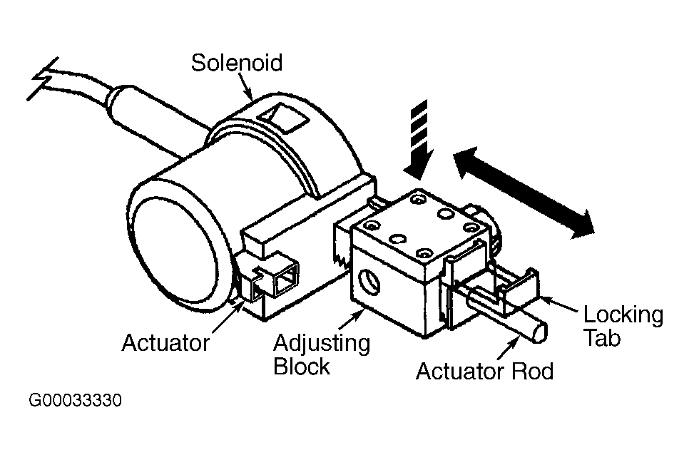BTSI solenoid (actuator) is located on steering column. See Fig 1. Pull locking tab outward from adjusting block. See Fig 2. Press on adjusting block to disengage adjusting teeth. Slide adjuster block as far away from actuator as possible. Lock adjuster block in place by pushing inward on tab. Ensure proper system operation.