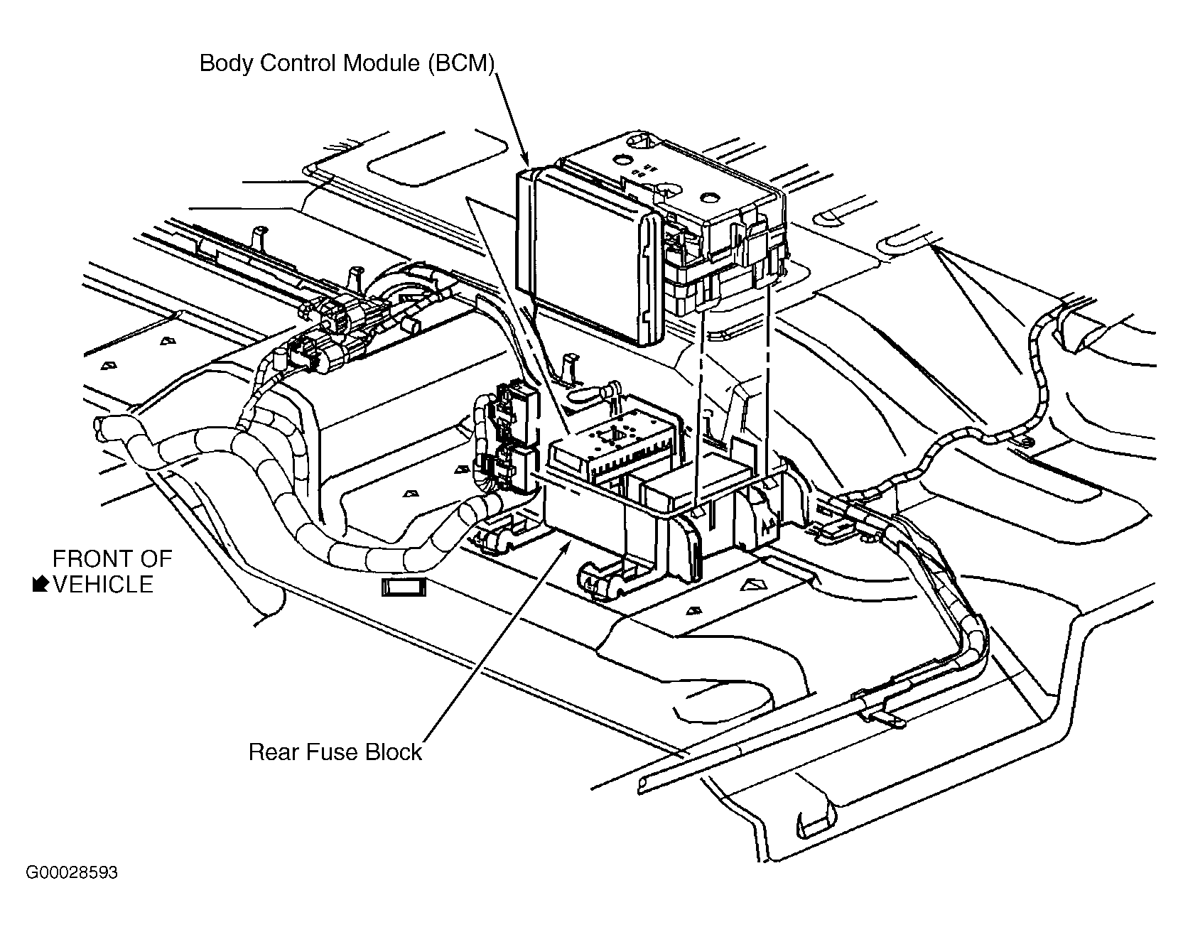 | Body Control Module (BCM) | Beneath left rear seat, on rear fuse block. See Figure. |