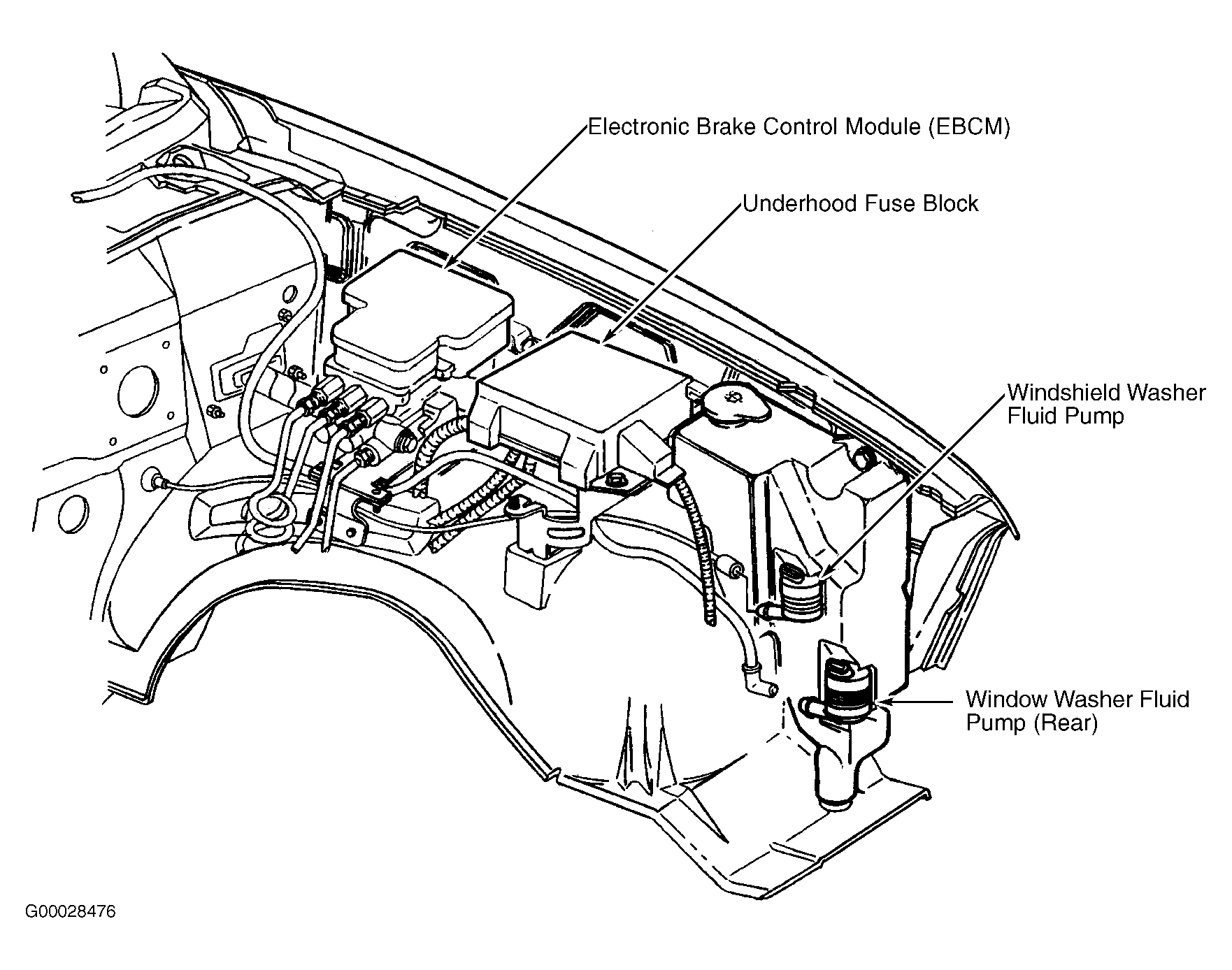 Electronic Brake Control Module (EBCM) On left front inner fender, on brake pressure modulator valve. See Figure.