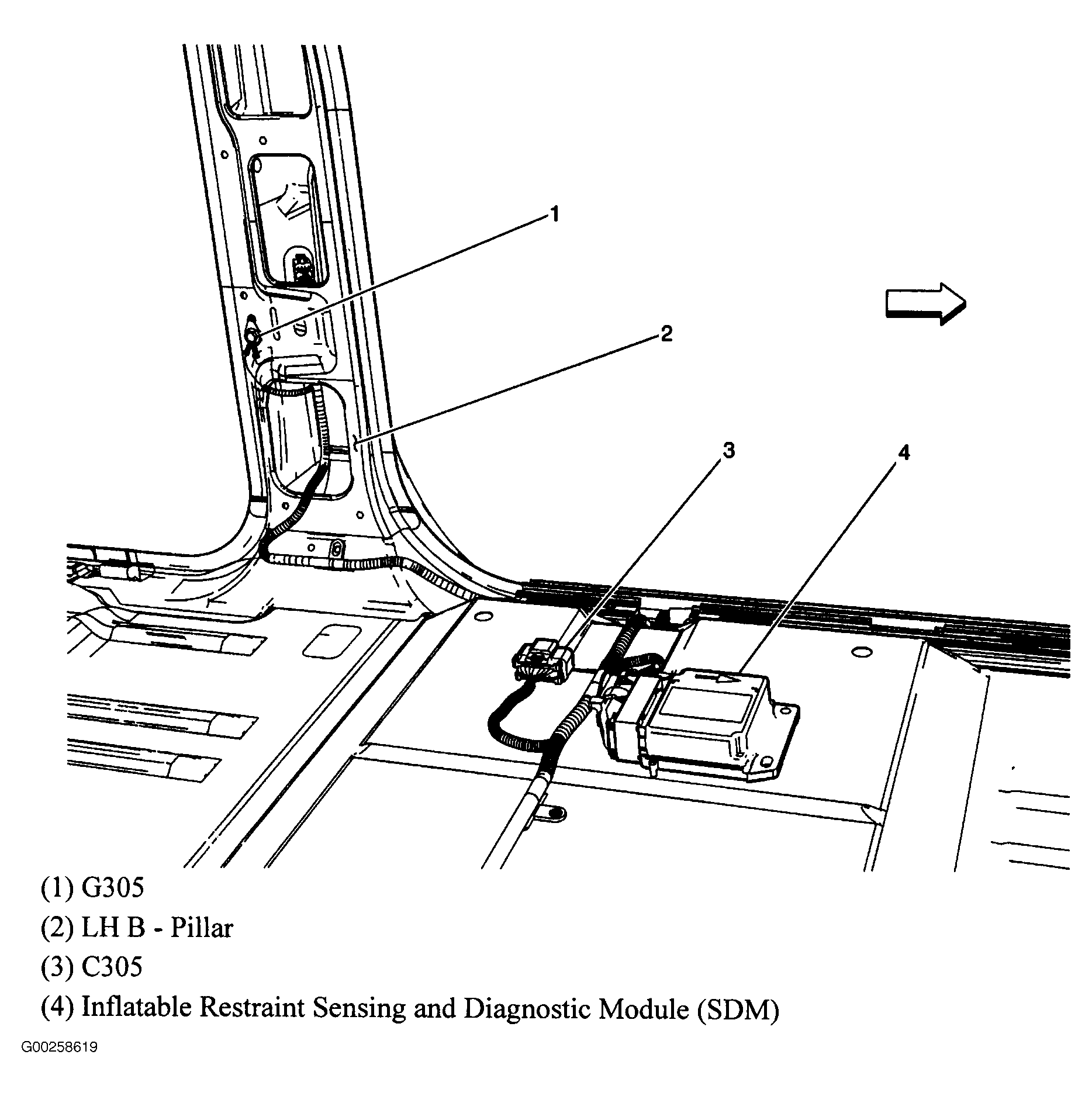 Inflatable Restraint Sensing And Diagnostic Module (SDM) Under left front seat. See Figure.