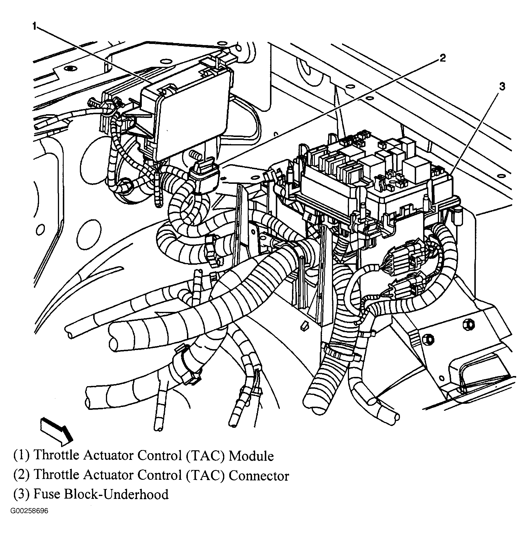 Throttle Actuator Control (TAC) Module (4.8L, 5.3L & 6.0L) At left rear of engine compartment. See Figure.