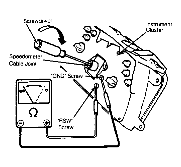 Disconnect battery. Remove instrument cluster. Connect ohmmeter between "GND" screw and "RSW" screw of combination meter. See Fig 1 . Turn cable joint of speedometer with a screwdriver. Ohmmeter should vary between infinite and zero ohms of resistance 4 times for every one revolution of speedometer cable joint.