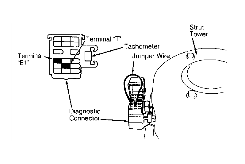 1. Inspect timing mark indicator and crankshaft pulley notch. See Figure . Clean timing marks if necessary. Remove diagnostic connector cover, located on left strut tower. Connect tachometer to specified terminal of diagnostic connector. See Fig 1 .