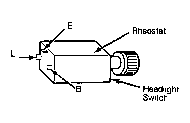 - To check rheostat in switch, remove switch from dash panel and connect battery positive (+) to terminal "B" of switch. Connect battery negative (-) to terminal "E" of switch. Connect a test light between terminal "L" and battery positive (+) terminal. See Fig 1