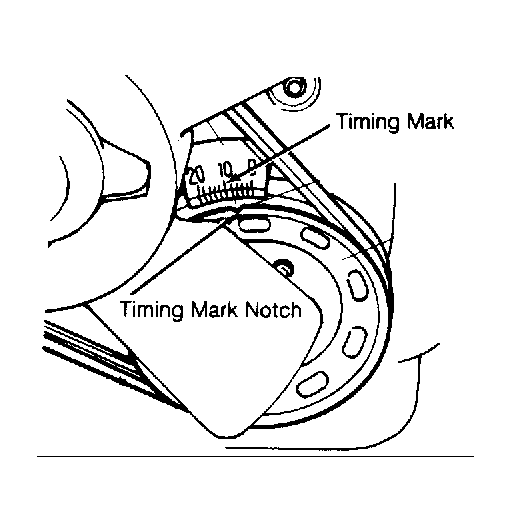 1. Inspect timing indicator mark and crankshaft pulley notch. Clean marks if necessary. See Figure . Start and warm engine to normal operating temperature. Ensure idle speed is within specification. See IDLE SPEED SPECIFICATIONS table. Turn off engine and all accessories. Attach timing light to No. 1 spark plug wire.