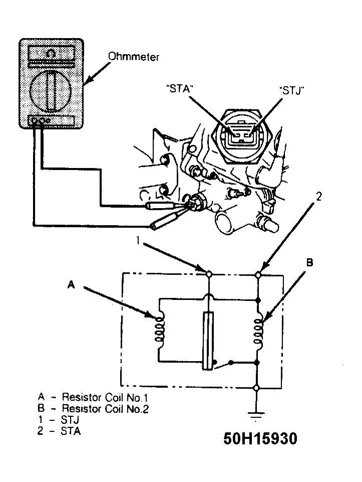1. With engine coolant less than 86°F (30°C), disconnect cold start injector thermal timer electrical connector. Using an ohmmeter, ensure resistance across terminals "STJ" and "STA" is 20-40 ohms. See Fig 1 .
