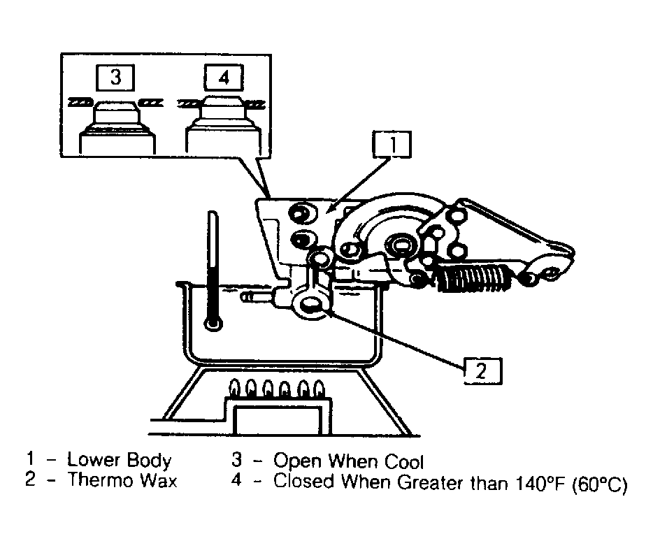 Remove throttle body assembly from intake manifold. Separate upper and lower bodies. Remove air valve from lower body and place sensing portion of air valve in water. See Fig 1 . Heat water to 140°F (60°C). Ensure valve fully closes. Replace valve if it does not perform as described. Reassemble both bodies and tighten screws to 31 INCH lbs. (3.5 N.m).