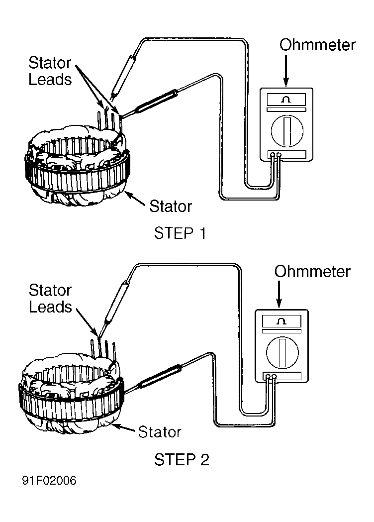 - Using an ohmmeter, check for continuity between stator leads and stator core. Perform STEP 2. See Figure. If continuity exists, replace stator.