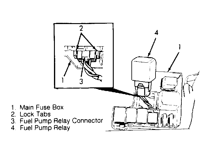 - Loosen fuel tank cap to release fuel tank pressure. Remove cover from main fuse box located in left front corner of engine compartment, behind the battery. Remove coolant reservoir from bracket. Remove main fuse box retaining screws. From underneath main fuse box, release 2 locking tabs of fuel pump relay. See Fig 1