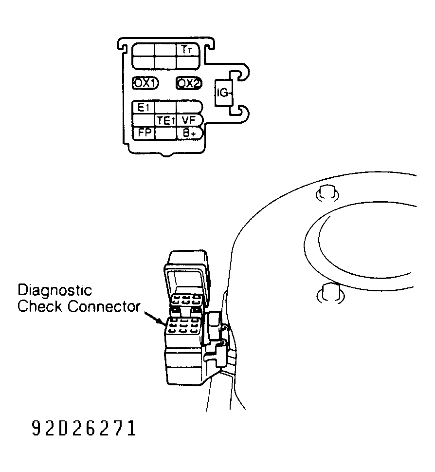 All trouble codes except for Code 51 (Switch Condition Signal) and Code 53 (Knock Control Signal) are stored in ECM memory. Codes 51 and 53 are erased from memory as soon as ignition is turned off. In order to detect an active Code 51 or 53, ignition switch must be in ON position (engine off) with diagnostic request terminal "TE1" in diagnostic check connector grounded. See Figure . Diagnostic check connector is located on left shock tower.