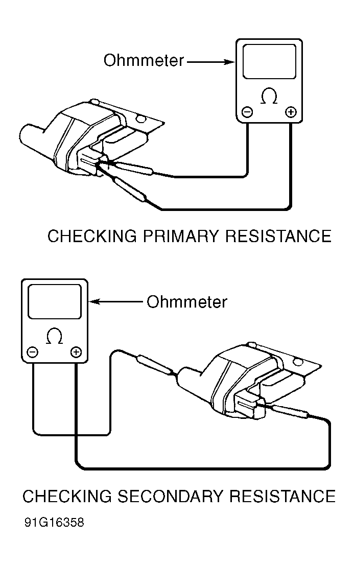 Disconnect electrical connector and ignition coil wire from ignition coil. Using ohmmeter, measure primary and secondary resistance. See Fig 1 . Replace ignition coil if readings are not within specification. See IGNITION COIL RESISTANCE table.