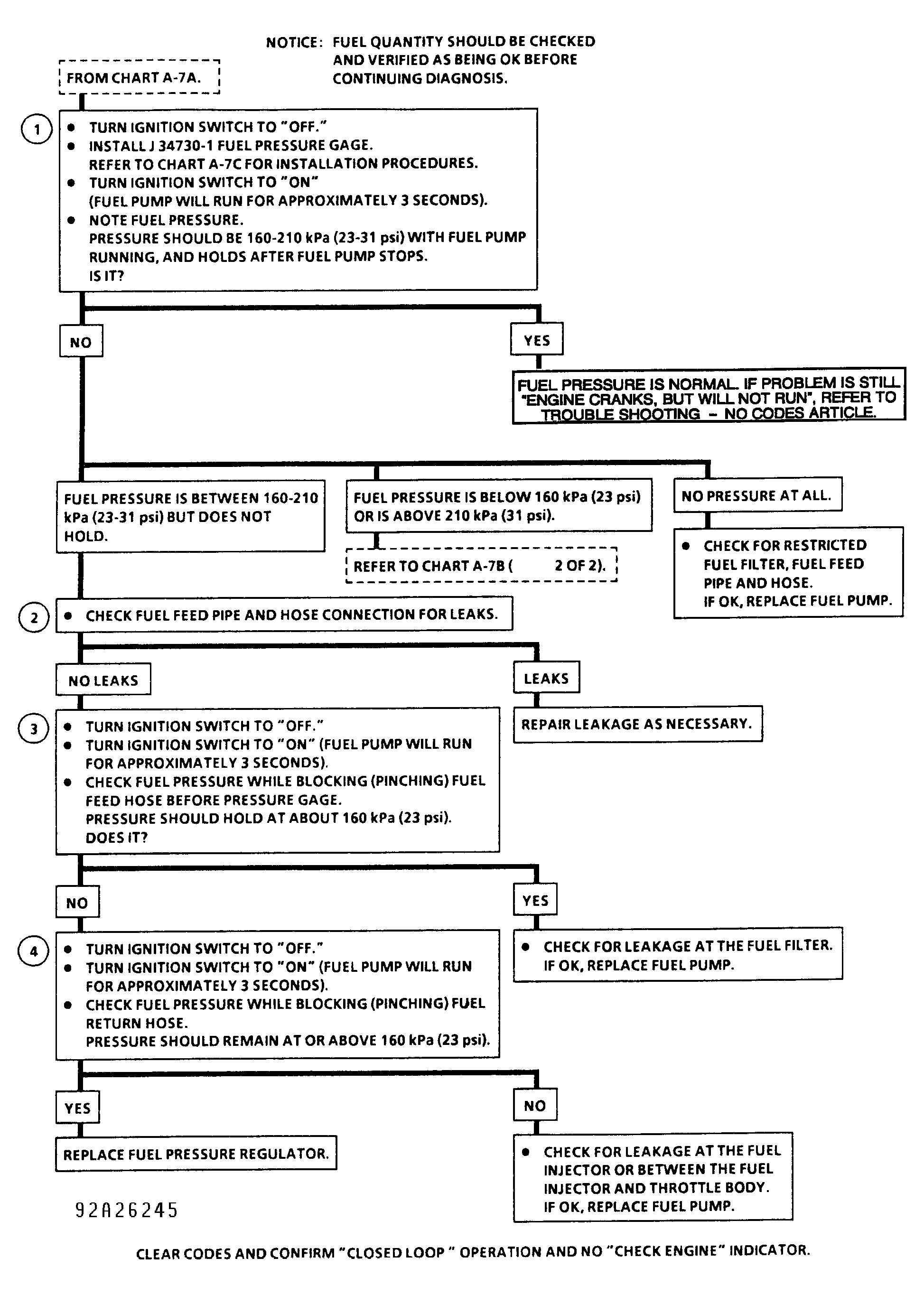 Release fuel pressure. See FUEL PRESSURE RELEASE  . Disconnect negative battery cable. Remove air cleaner assembly. Remove fuel inlet hose from throttle body. Install Fuel Pressure Gauge (J-34730-1) and Adapter (J-34730-75). See Fig 1 . Reconnect negative battery cable. Check fuel pressure. SeeFigure , Figure and Figure . Release fuel pressure. Remove fuel pressure gauge.