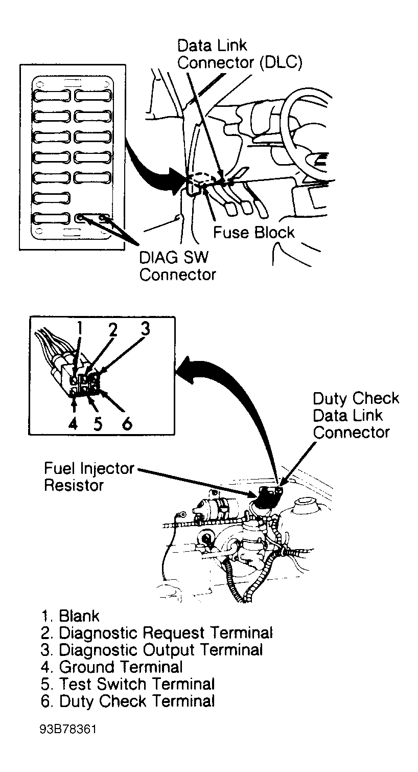 - To retrieve code(s) using the duty check data link connector, connect jumper between duty check data link connector terminals No. 2 and 4. See Fig 1 . Turn ignition on and observe MIL to read fault code(s). Proceed to appropriate chart(s) under DIAGNOSTIC CODE CHARTS to diagnose fault codes.