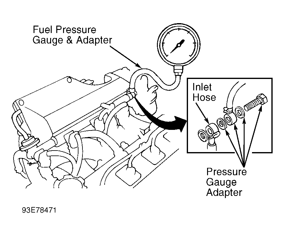 2. Install Adapter (J-38347) and 2 new gaskets. See Fig 1 . Tighten adapter retaining bolt to 13 ft. lbs. (18 N.m). Install Fuel Pressure Gauge (J-34730-B). Ensure shutoff valve is closed on fuel pressure gauge.
