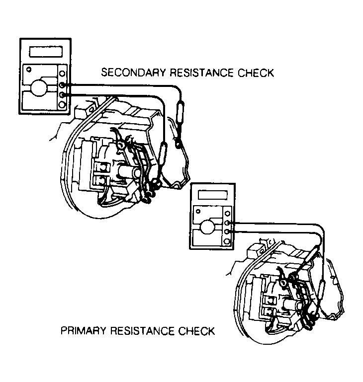 Remove distributor cap, rotor and dust cover. Using an ohmmeter, measure primary and secondary resistance. See Fig 1 . Replace ignition coil if readings are not within specification. See the IGNITION COIL RESISTANCE table.