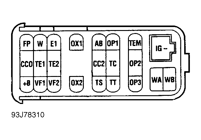 - While backprobing PCM connector C1 from cavity A4 (M/T) or A14 (A/T) to ground, momentarily connect jumper from DLC terminal B+ to terminal FP if fuel pump does not run. See Figure . If fuel pump runs, remove jumper and backprobe circuit opening relay connector from cavity No. 2 to ground using a test light. If test light does not glow, repair open in Black/Red wire between fuse and relay box and circuit opening relay.