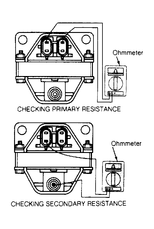 Disconnect electrical connector and high tension coil wire from ignition coil. Using ohmmeter, measure primary and secondary resistance. See Fig 1 . Replace ignition coil if readings are not within specification. See IGNITION COIL RESISTANCE  table.
