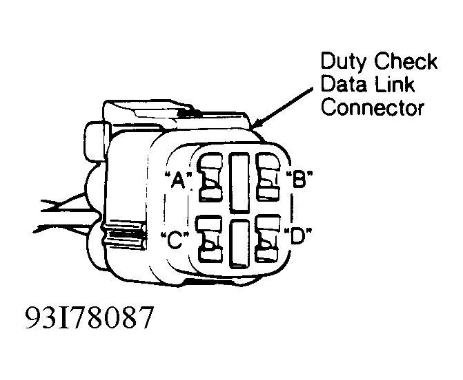 2. Connect timing light to No. 1 spark plug wire. Remove cap from duty check Data Link Connector (DLC), located near fusible link box, by battery. Connect a jumper wire between terminals "C" (Black wire) and "D" (Blue/Red wire) of duty check DLC. See Fig 1 .