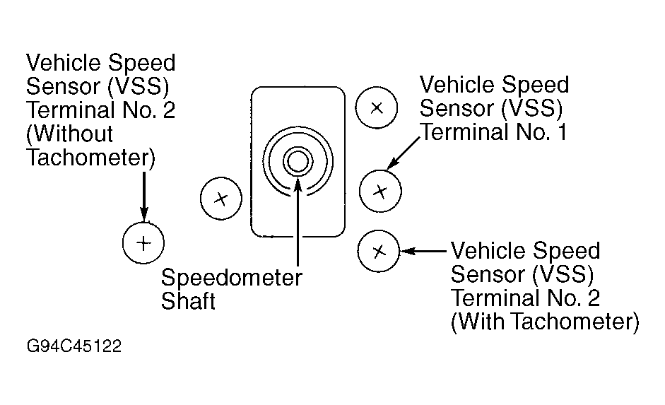 Vehicle speed sensor is mounted in rear of instrument cluster. A malfunction in the vehicle speed sensor circuit will set diagnostic trouble Code 24. For testing procedures, see TESTS W/CODES article in this section. For identification of vehicle speed sensor terminals, see illustrations. See Fig 1 .