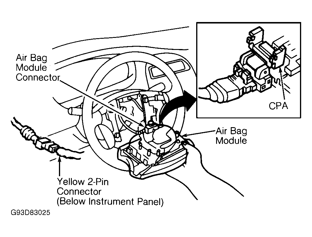 - Ensure front wheels face straight ahead. Turn ignition switch to LOCK position. Remove CIG & RADIO fuse and IGN fuse from junction block. See Fig 1 . Locate driver side air bag Yellow 2-pin connector at base of steering column. See Fig 2 . Remove Connector Position Assurance (CPA) clip and disconnect Yellow 2-pin connector.