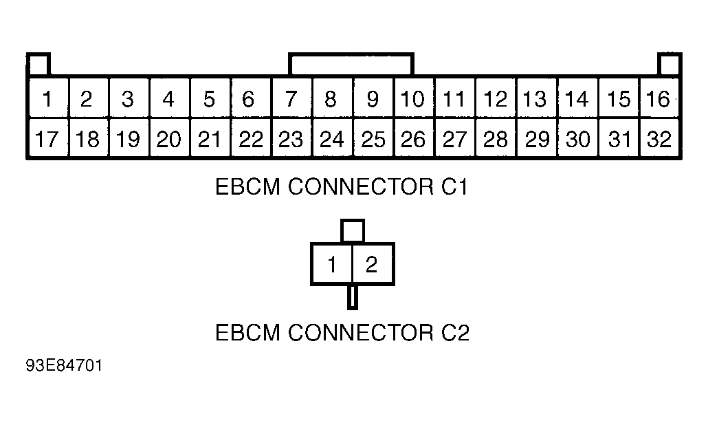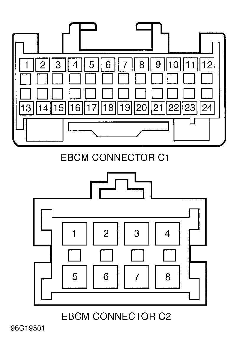 1995 models use a 32-pin (C1) and a 2-pin (C2) EBCM connector. 1996 models use a 24-pin (C1) and a 8-pin (C2) EBCM connector. See Fig 1