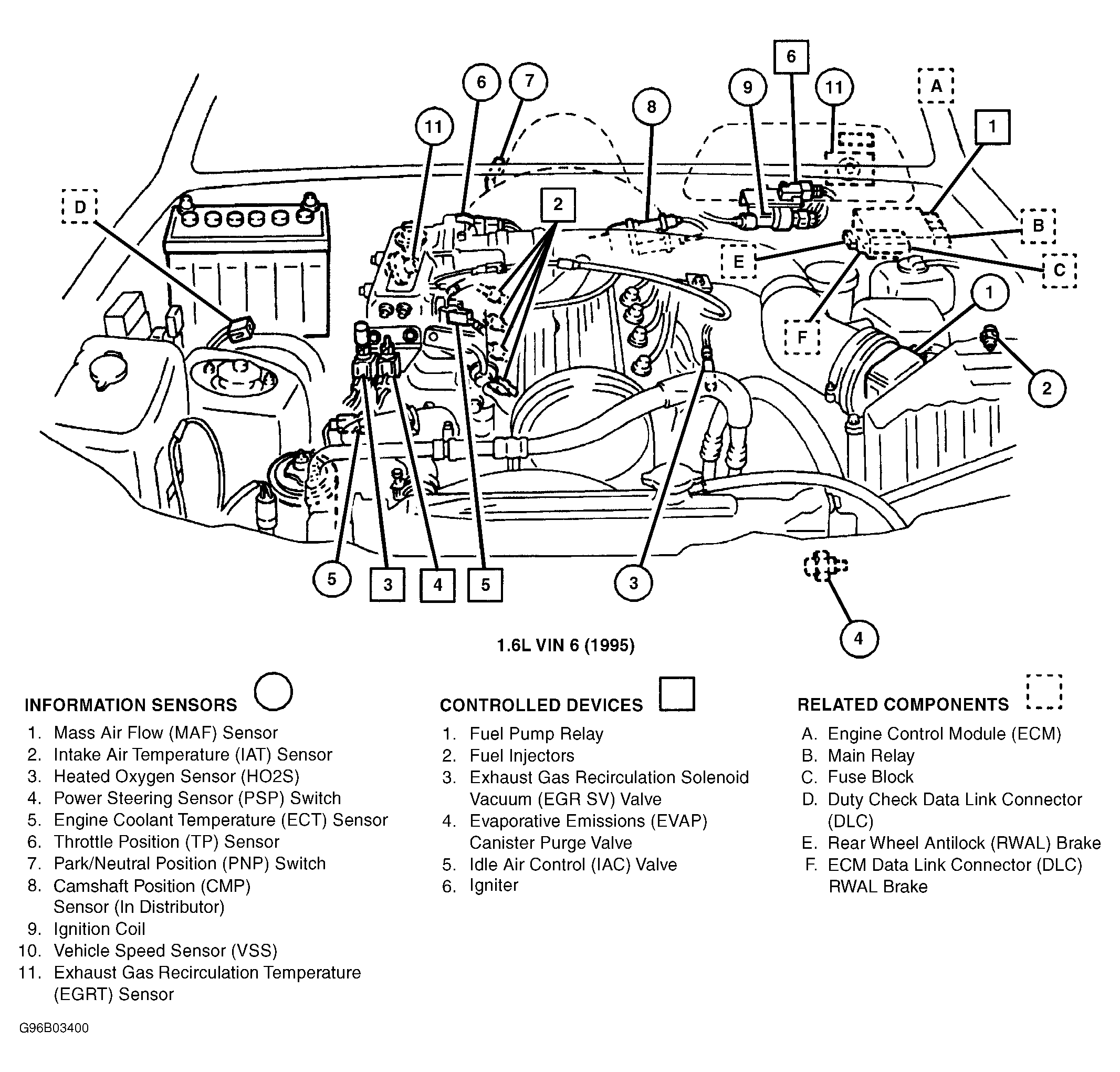 | Fuse Block (1.6L VIN 6) (1995) | Behind dash, left of steering column. See Figure . |