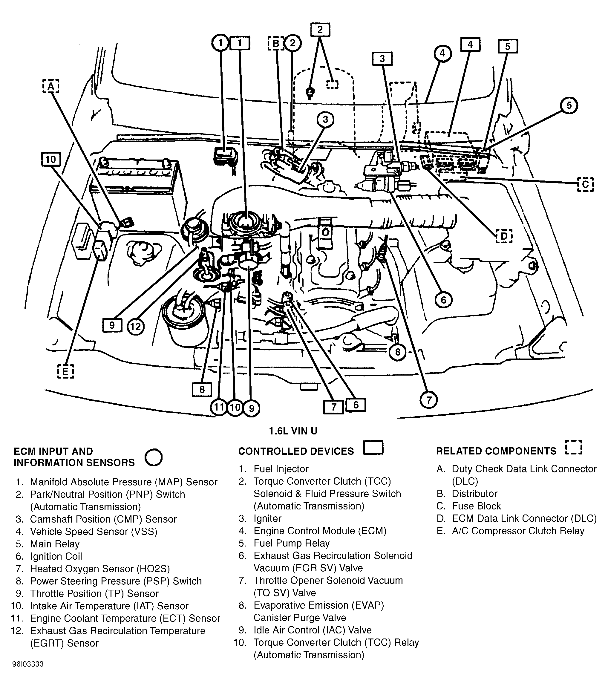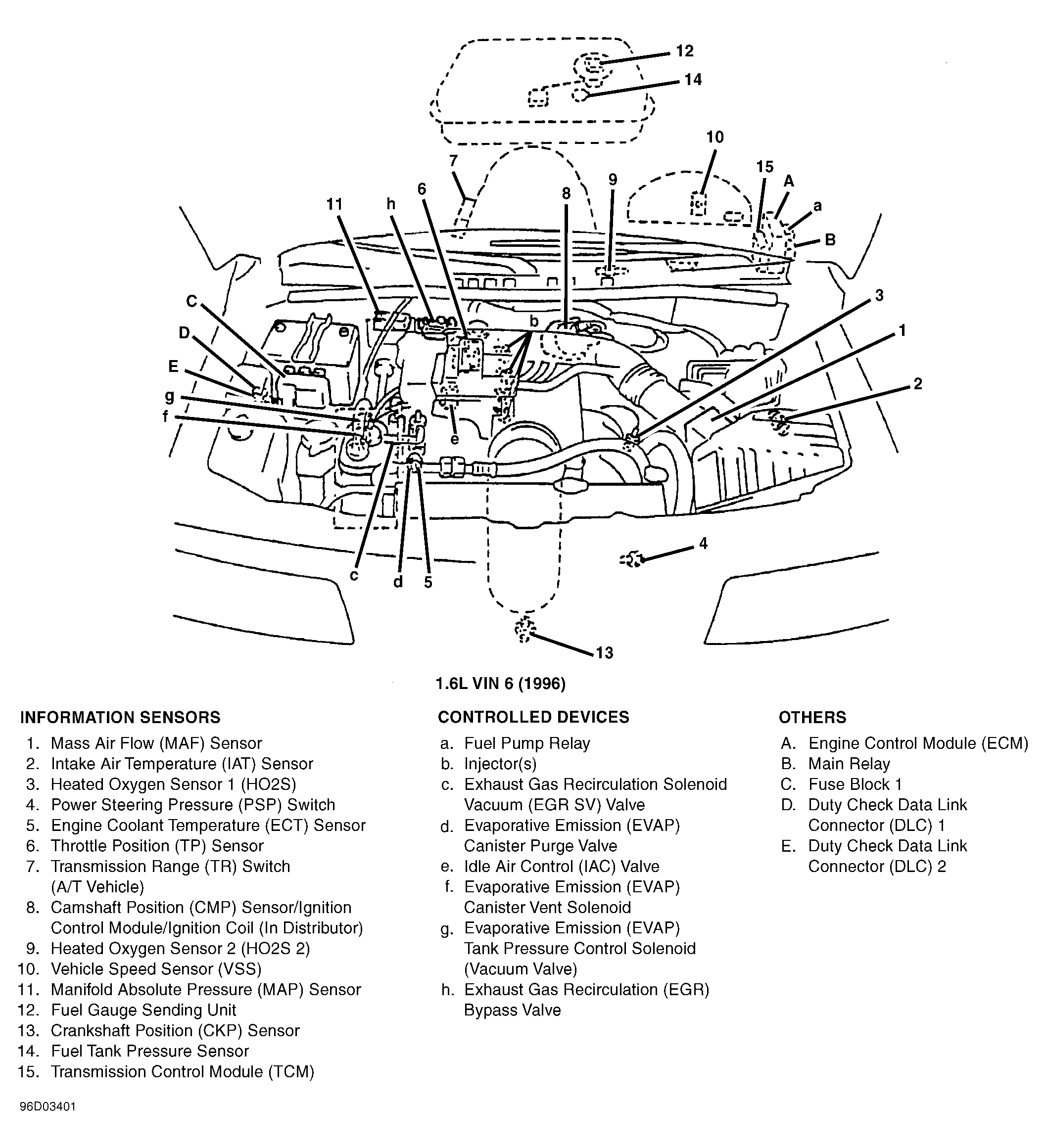 | Fuse Block No. 1 (1.6L VIN 6) (1996) | On right side of engine compartment, front of battery. See Figure . |
