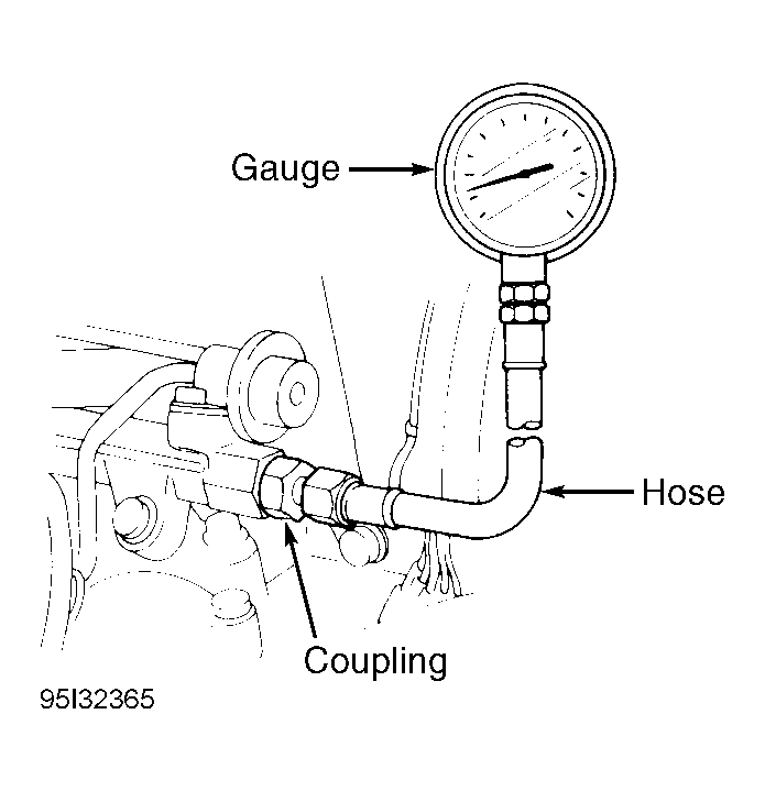1. Start engine. Warm to normal operating temperature. Turn ignition off. Release fuel system pressure. See FUEL SYSTEM PRESSURE RELEASE  . Remove plug bolt on fuel rail. Install coupling, pressure gauge and hose to fuel rail. See Fig 1 . Verify battery voltage is 11 volts or greater. Start engine and ensure no leakage exists at pressure gauge connection. Turn engine off.