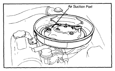 2. Start engine and run at idle speed. Check for bubbling noise from air suction port. See Fig 2. If bubbling noise is not heard, proceed to step  5. If bubbling noise is heard, disconnect hose from control switch at air suction cut-off diaphragm.