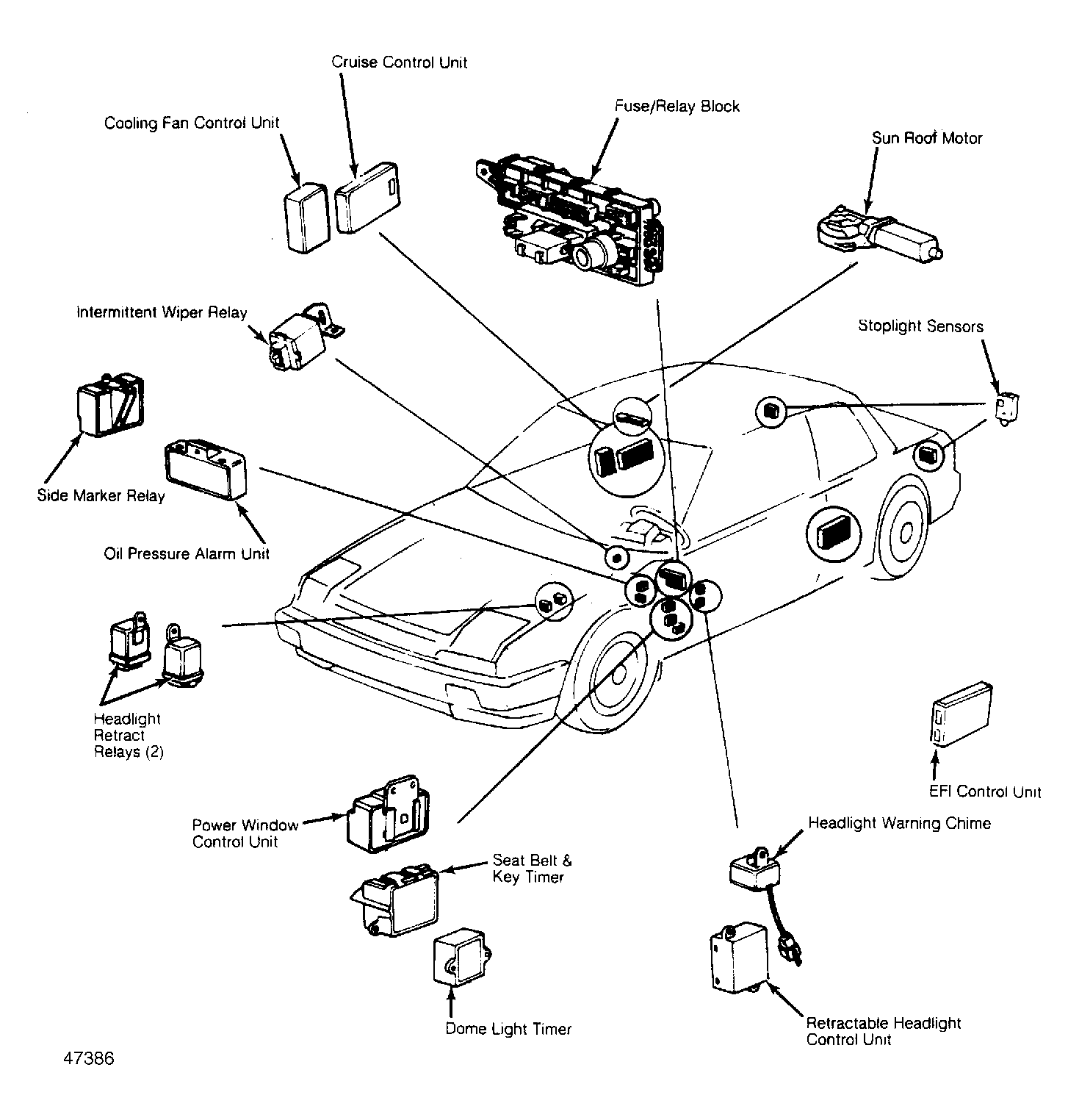 | A/C Delay Unit (EFI) | Behind dash, below blower motor. | |