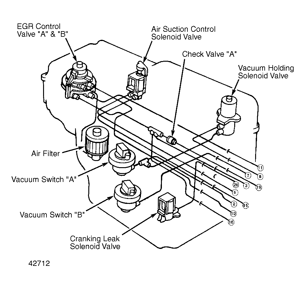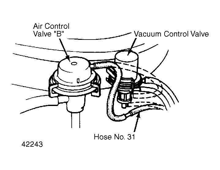6. If voltmeter indicates 12 volts and engine operating condition is normal, check vacuum lines of system for blockage, leaks or disconnected hoses. If no problem exists, check both air control valves A and B.