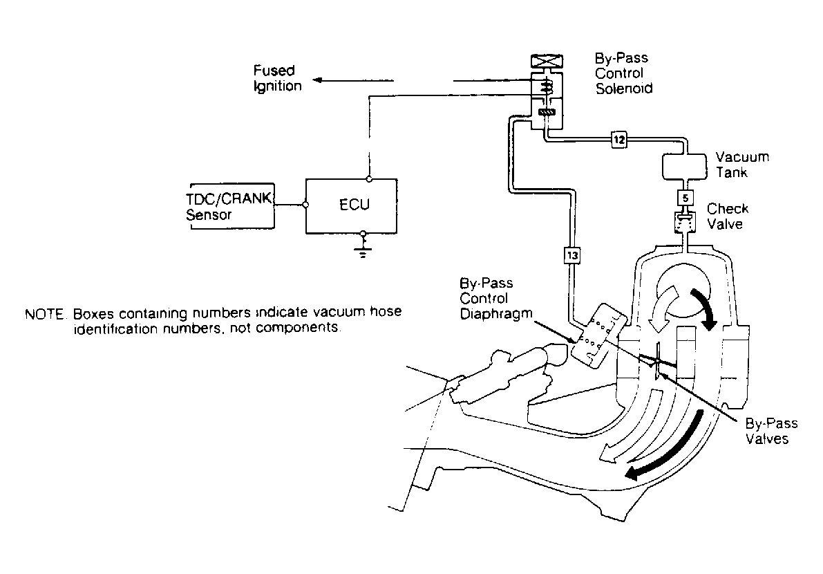- If no vacuum is present, disconnect vacuum supply hose from by-pass control solenoid. Check for vacuum. If vacuum is present, proceed to step 6). If no vacuum is present, check vacuum line between solenoid and intake manifold. Repair as necessary.