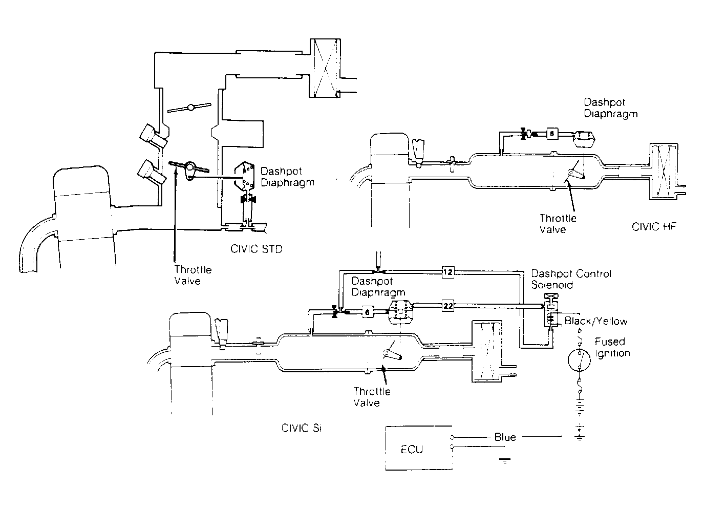 Throttle control system used on Civic Si models is a dual-function system designed to limit the formation of noncombustible mixtures in the combustion chamber during deceleration and assist engine starting during extremely low ambient temperature. The system consists of a dual-diaphragm dashpot, dashpot control solenoid and Electronic Control Unit (ECU).