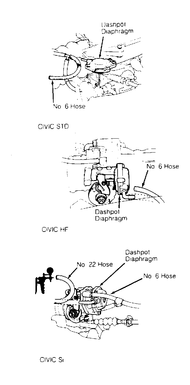 - Start engine and allow to idle. Disconnect vacuum hose No. 6 from dashpot diaphragm and connect vacuum gauge to hose. See Figure