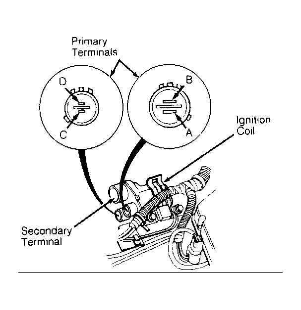 - If light is on, turn ignition off. Disconnect 2 primary connectors at ignition coil. Measure resistance between terminals B and D of coil. See Fig 1