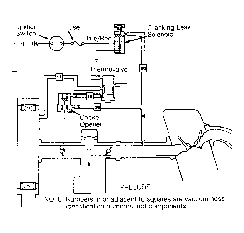 The choke control system is designed to regulate choke valve angle based upon engine coolant temperature. Choke valve position is also modified by a cranking leak solenoid when ignition switch is in the "START" position. System consists of a thermovalve, dual-action choke opener diaphragm, 2 restricted orifices (Prelude) and cranking leak solenoid. See Fig 1 or Fig 2 .