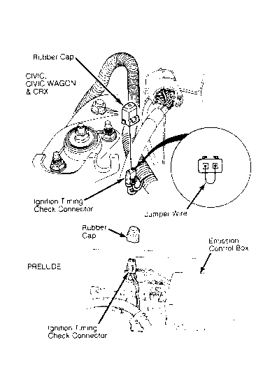 - Remove Yellow rubber cap from ignition timing check connector. Connector is located on left rear side of engine compartment. Connect jumper wire between Brown and Green/White wire terminal connectors. See Fig 1