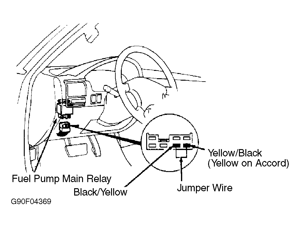 2. Remove connector from fuel pump main relay. See Fig 1 . With a test light, check for battery voltage on Black/Yellow wire at fuel pump relay connector. If battery voltage is present, jumper Black/Yellow (positive) and Yellow (ground). If fuel pump runs, proceed to step 3). If fuel pump fails to run, see SYSTEM/COMPONENT TESTS - EFI article. If no voltage is present on the Black/Yellow wire, check for open in wire between fuel pump main relay connector and No. 2 fuse on fuse box. Proceed to step 3) after repairing circuit.