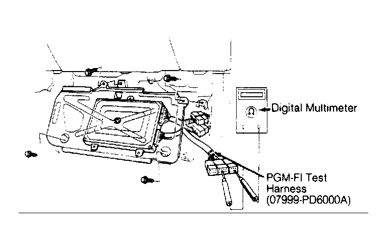 - Turn ignition off. Reconnect O2 sensor connector. Attach ECU Test Harness (07999-PD6000A ) between ECU and ECU connector. See Figure . Connect voltmeter between ECU terminals A18 (-) and C16 (+). See Figure . Restart and warm engine to normal operating temperature. Hold engine speed at 4000 RPM for 10 seconds, and then close throttle completely.