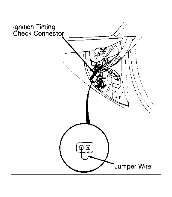 - Remove rubber cap from inspection window on bellhousing of cylinder block. Start and warm engine to normal operating temperature (cooling fan comes on). Connect a jumper wire between Orange/Red and Green/White wire terminals of ignition timing check connector located in passenger-side kick panel. See Fig 1