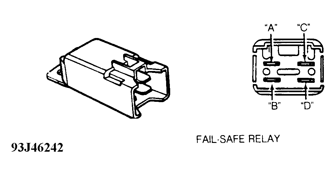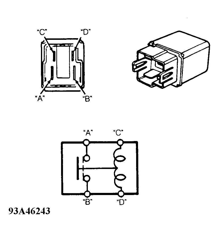 . Continuity should not exist. Apply battery voltage across terminals "C" and "D". Continuity should exist between terminals "A" and "B". If continuity is not as indicated, replace relay.