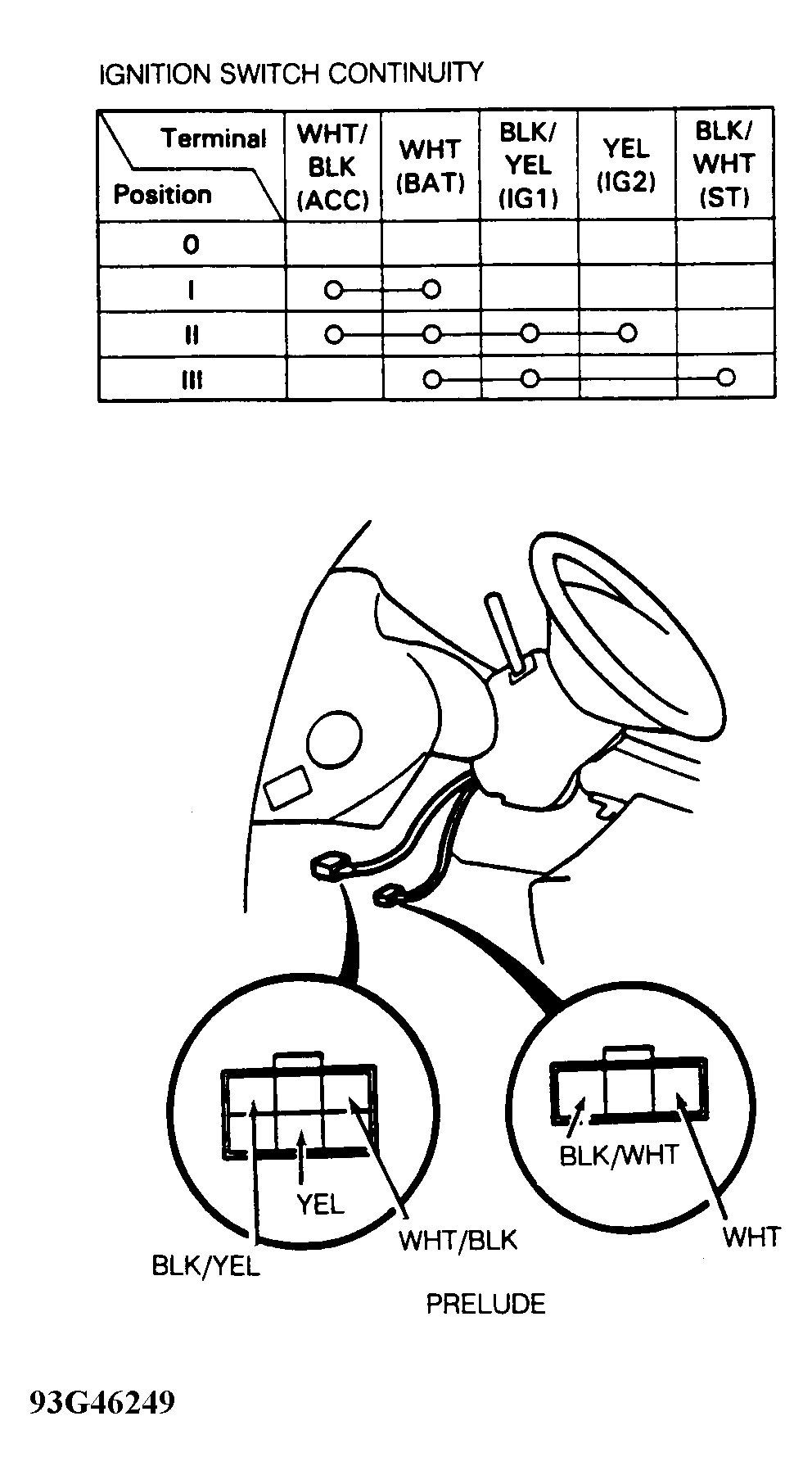 Remove lower instrument panel cover and driver's side knee bolster. Disconnect 6-pin connector from dash fuse box and 3-pin connector from main wire harness. See Fig 1. Use an ohmmeter to check continuity at connector terminals with switch in indicated position. If continuity is not as specified, replace ignition switch.