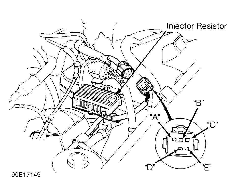 Unplug injector resistor harness connector. Injector resistor is located over at upper left firewall. Measure resistance between each injector resistor terminal ("B", "C", "D" and "E") and power terminal ("A"). See Fig 1 . Resistance should be 5-7 ohms for each pair of terminals. If any measurement is not as specified, replace injector resistor.
